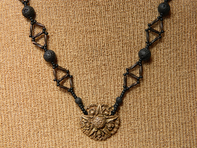Next, I made a necklace with another Lesley Watt component and more lava beads.  I got some gorgeous twisted bugles recently that have an antique brass look to them.  I used them and some matte black seed beads.  I really like how this necklace turned out.  Initially, I was going to fill each triangle with a lava bead, but opted to let them remain open.  It turned out better that way.